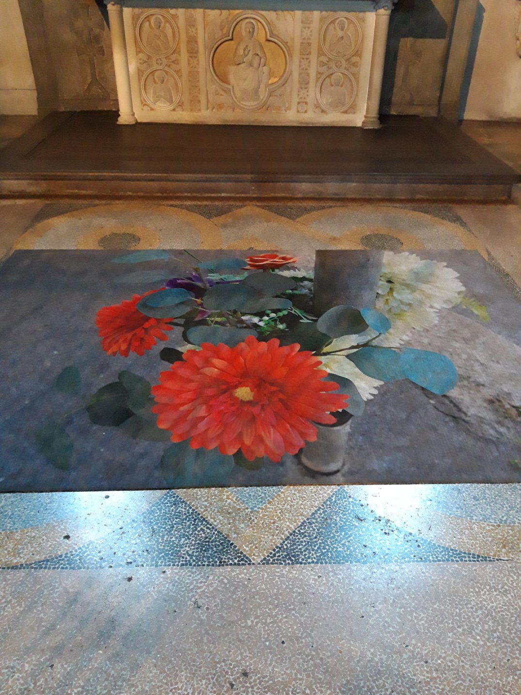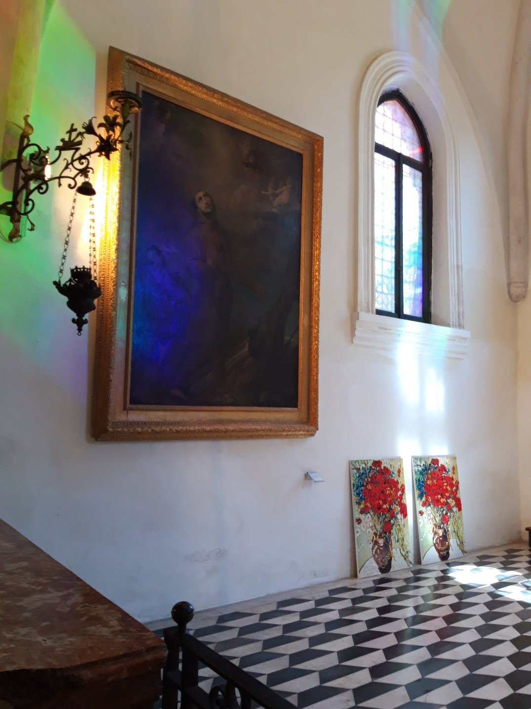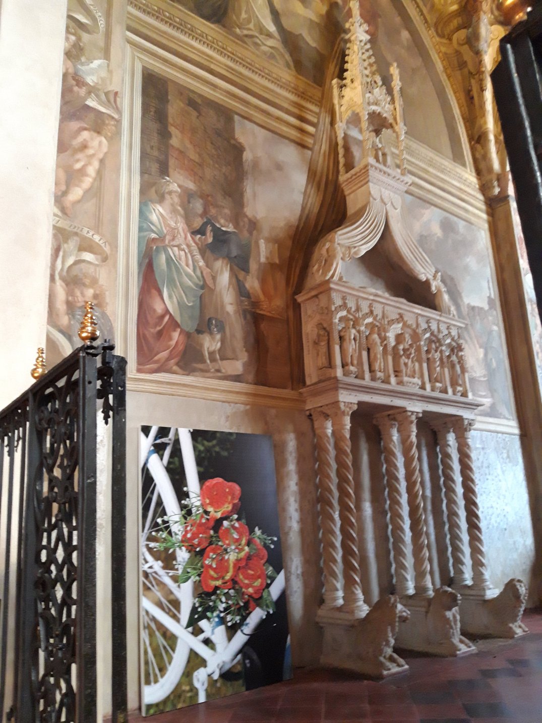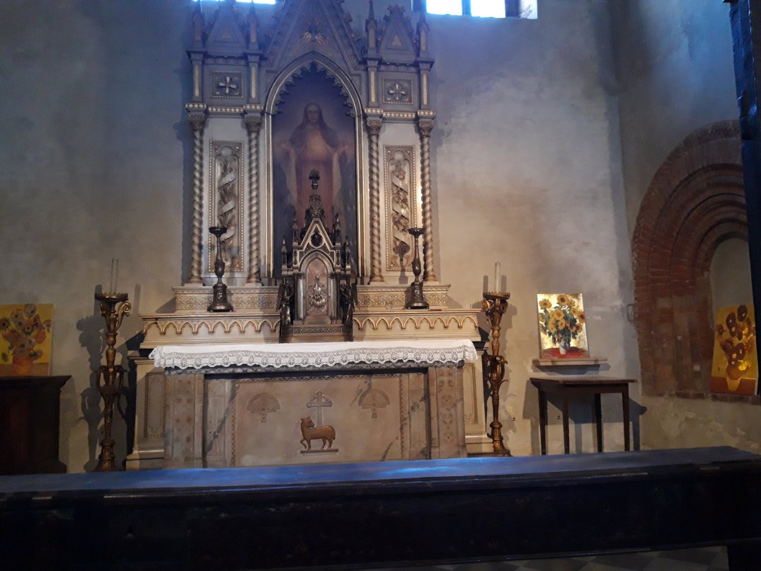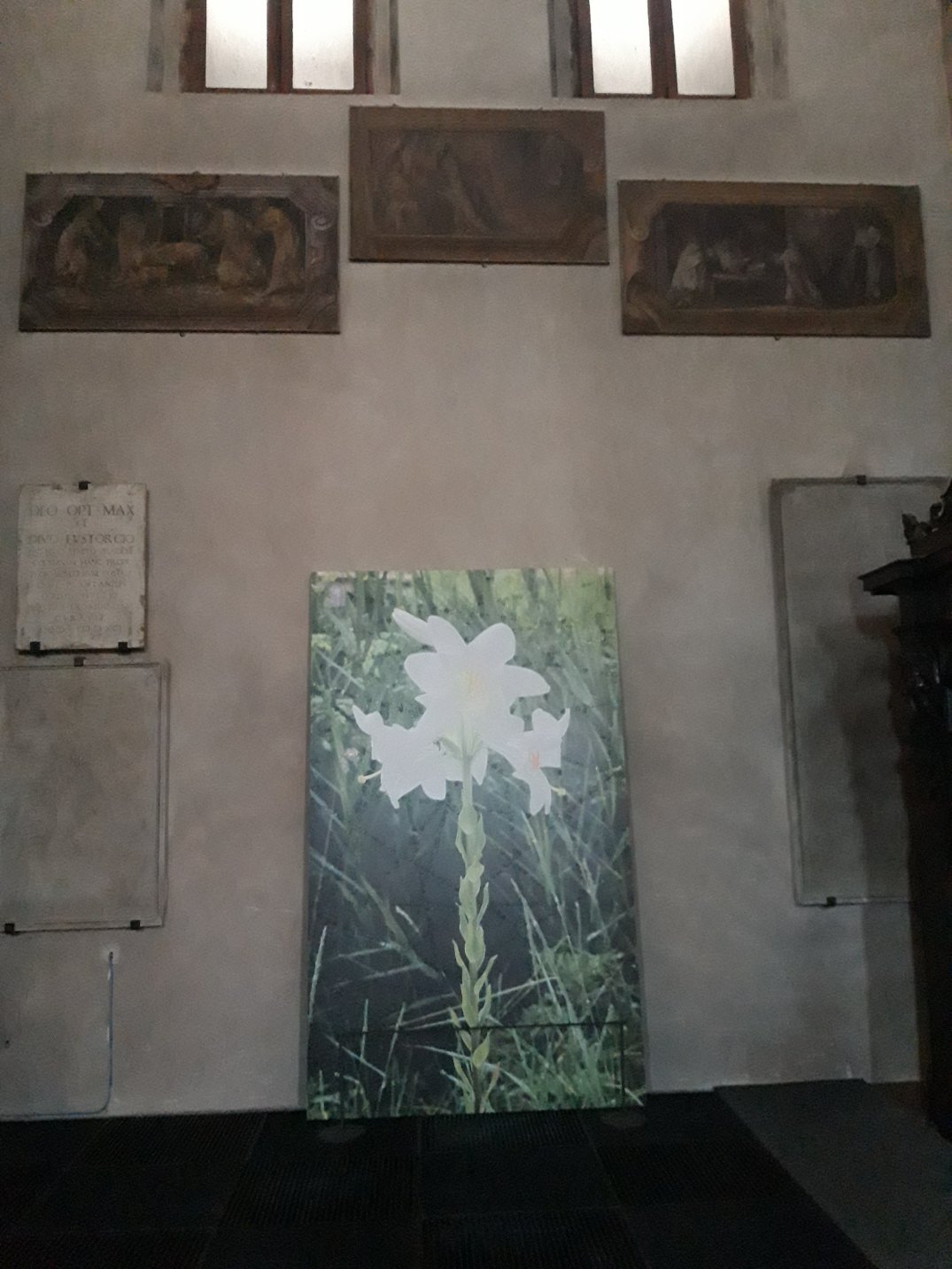 La realtà è che non sempre questa operazione di accostamento antico/contemporaneo dà buoni risultati e la mostra di Arienti a Sant’Eustorgio a mio parere ne é una prova. La brochure con la lettura di Angela Vettese aiuta ad avvicinare il visitatore alla concezione sottesa alle opere ma non é sufficiente: gli accostamenti dei lavori di Arienti alle opere antiche delle cappelle non trovano spiegazioni, né parallelismi, alcun rapporto! Paiono solo azzardati posizionamenti di opere che non dialogano per niente con l’ambiente in cui vengono collocate: le rivisitazioni ad esempio di Van Gogh e Monet dei fiori su fondo oro pretenderebbero di dialogare con i fondi oro antichi ma non sono nemmeno collocati accanto a fondi oro…Stesso discorso per i tappeti tinti collocati nella Sagrestia, mentre le stampe con cerniere o cuciture non hanno motivo di essere collocate in mezzo agli affreschi…