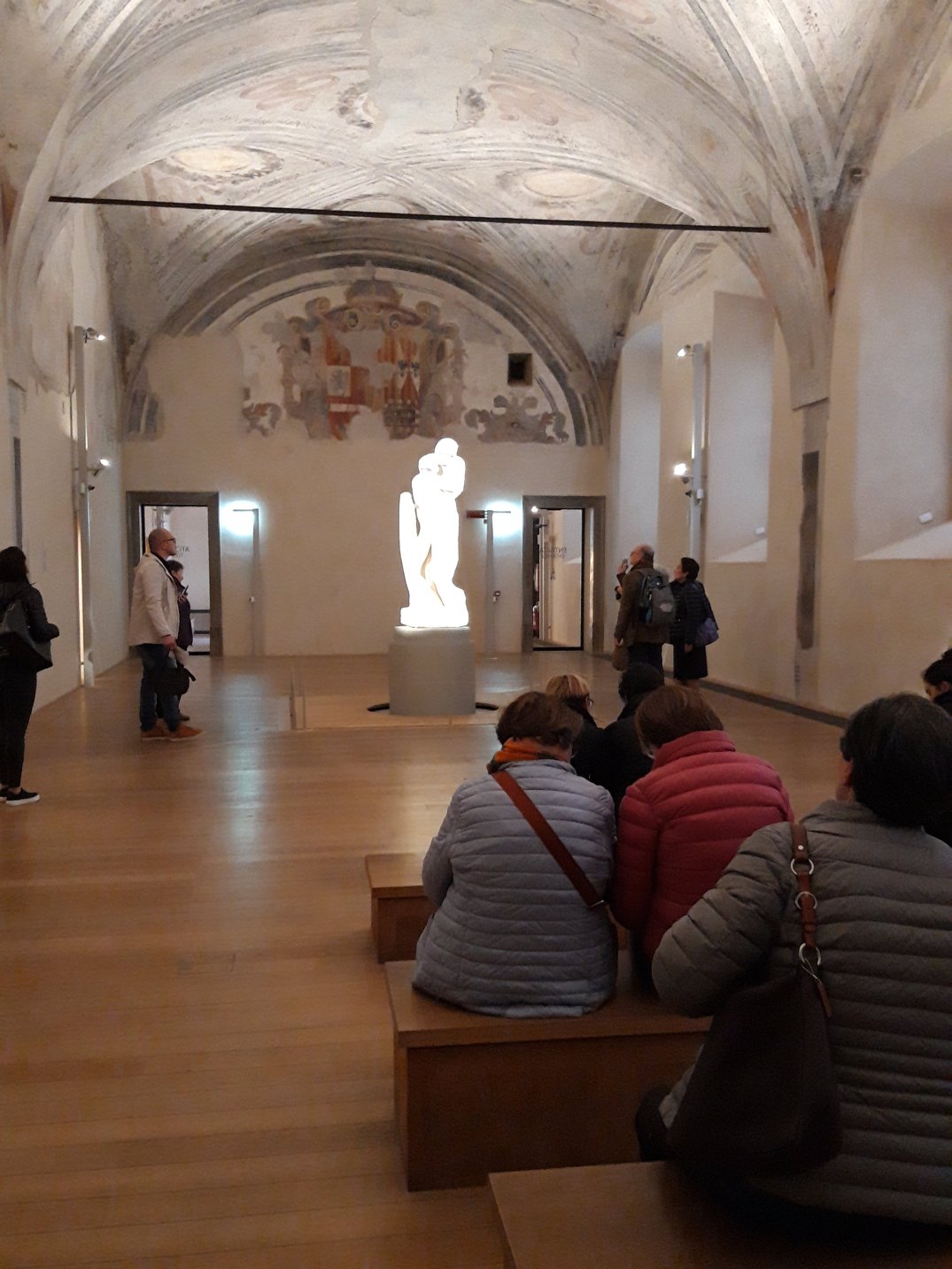 Niente più magia dietro alla paratía, niente più mistero. Si entra nella nuova sala e si vede l’opera dal retro… Francamente preferivo l’aspettativa che veniva creata dall’installazione anni ’50 dello Studio BBPR, invariata fino agli anni ’90. Capisco che l’arrivo delle nuove sculture del Bambaia abbia sovraffollato un po’ la sala ma… Speravo in una soluzione più esaltante. Se non altro il nuovo piedistallo è antisismico…