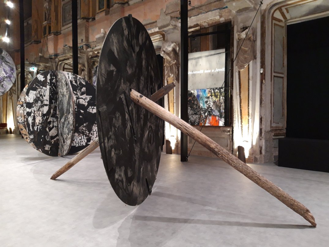 L’allestimento studiato dallo studio Kirimoto con una parete di 34 metri che taglia trasversalmente la Sala delle Cariatidi rende ancora più maestose e suggestive le opere esposte.